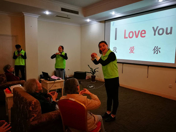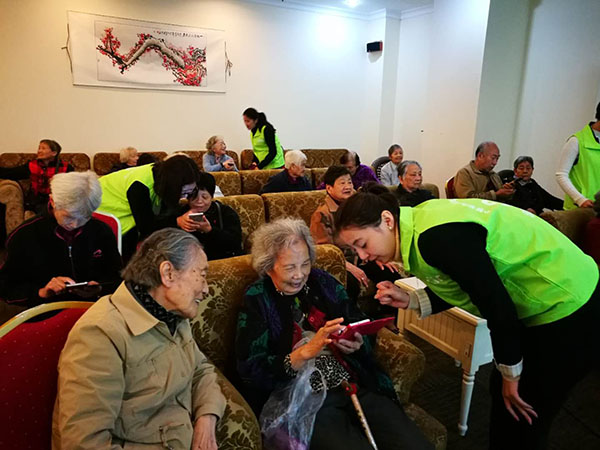 活動現場,老人們的學習熱情高漲,跟隨志愿者老師學習簡單英語口語,并且積極參與課堂活動。志愿者們還耐心教老人們如何使用微信等新型社交工具,幫助他們運用所學英語語句和親人朋友發送語音消息。