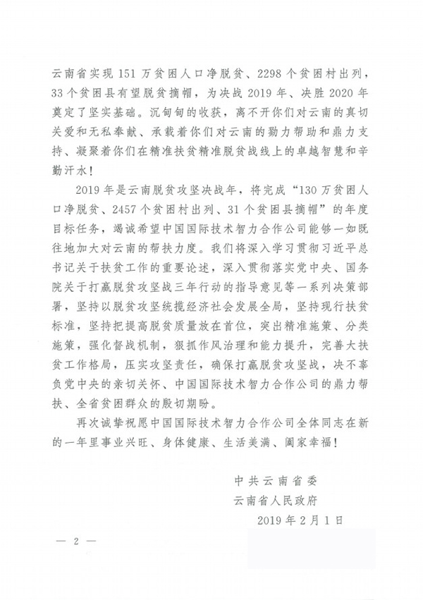 2019年春節(jié)前夕,中共云南省委、云南省人民政府向中智公司等單位發(fā)出感謝信,感謝中智公司等相關(guān)單位對云南脫貧攻堅的支持。希望中智公司進一步加大對云南的定點幫扶,為云南脫貧攻堅決戰(zhàn)2019年、決勝2020年做出更大貢獻。