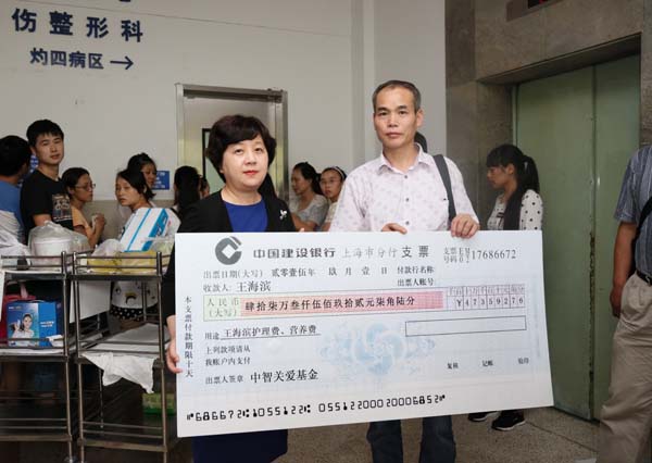 2015年9月1日,瑞金醫院灼傷科病房外,一張47萬元的支票由中智集團副總經理王慧遞交給了火海英雄、“中智好雇員”王海濱的父親,這其中包含著無數的牽掛和關愛,“我們是代表所有募捐者來傳達我們的關心,希望海濱能盡早康復,也希望你們能保重身體。”